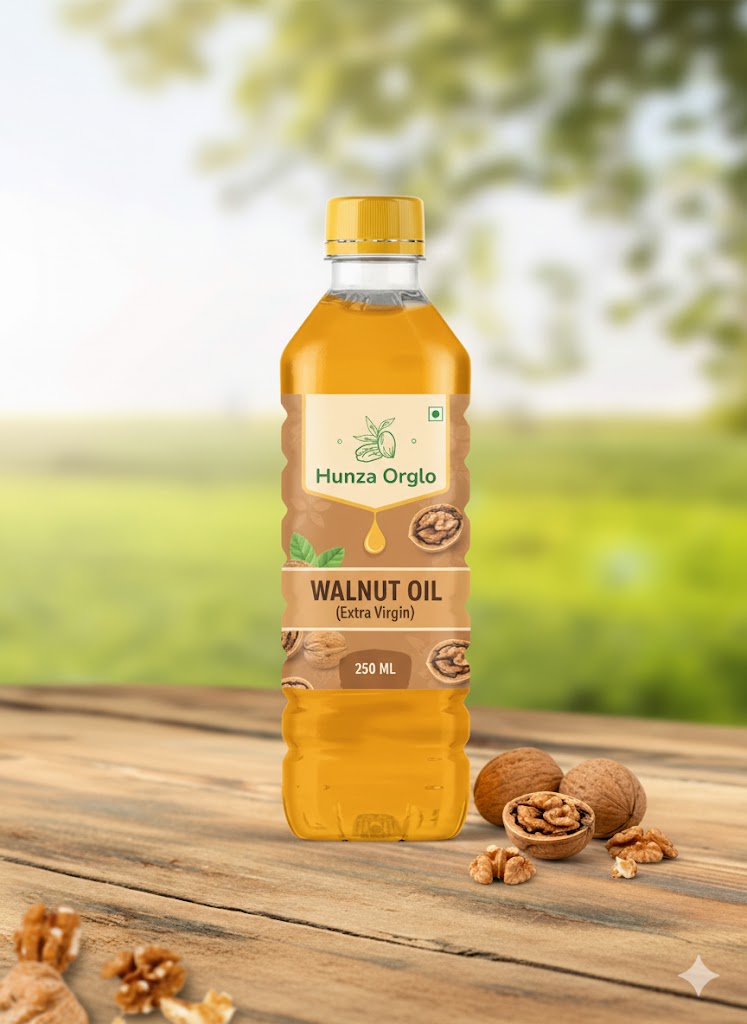 Experience the purity of Hunza Orglo Walnut Oil, cold-pressed from the finest Hunza walnuts to retain their natural richness. This golden oil is packed with omega-3 fatty acids, vitamins, and antioxidants that nourish your skin, boost hair strength, and promote overall wellness. Its lightweight texture absorbs easily, leaving a smooth, rejuvenated feel. Perfect for skincare, haircare, or even culinary use — a natural treasure straight from the valleys of Hunza.